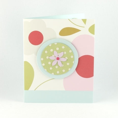 Beautiful flower paper is set on light blue cardstock for this card. The front of the card features an extra added circle with a flower petal held on by a brad. The card is perfect for Mother’s Day, birthdays, a quick thank you or as an anytime greeting.