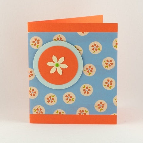 This orange cardstock features extra added blue flowered origami paper and flower with a green brad center.
