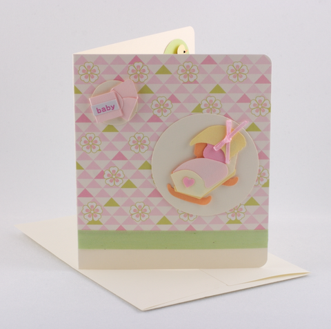 This cute pink rounded-edge baby cradle card is perfect for the expecting mom or to accompany a baby shower present.