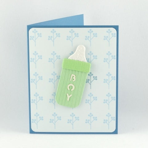 This budding flower light blue paper is set on blue cardstock. The card features an extra added “boy” baby bottle. This card is perfect for the expecting mom, a baby shower or even for the expecting dad!